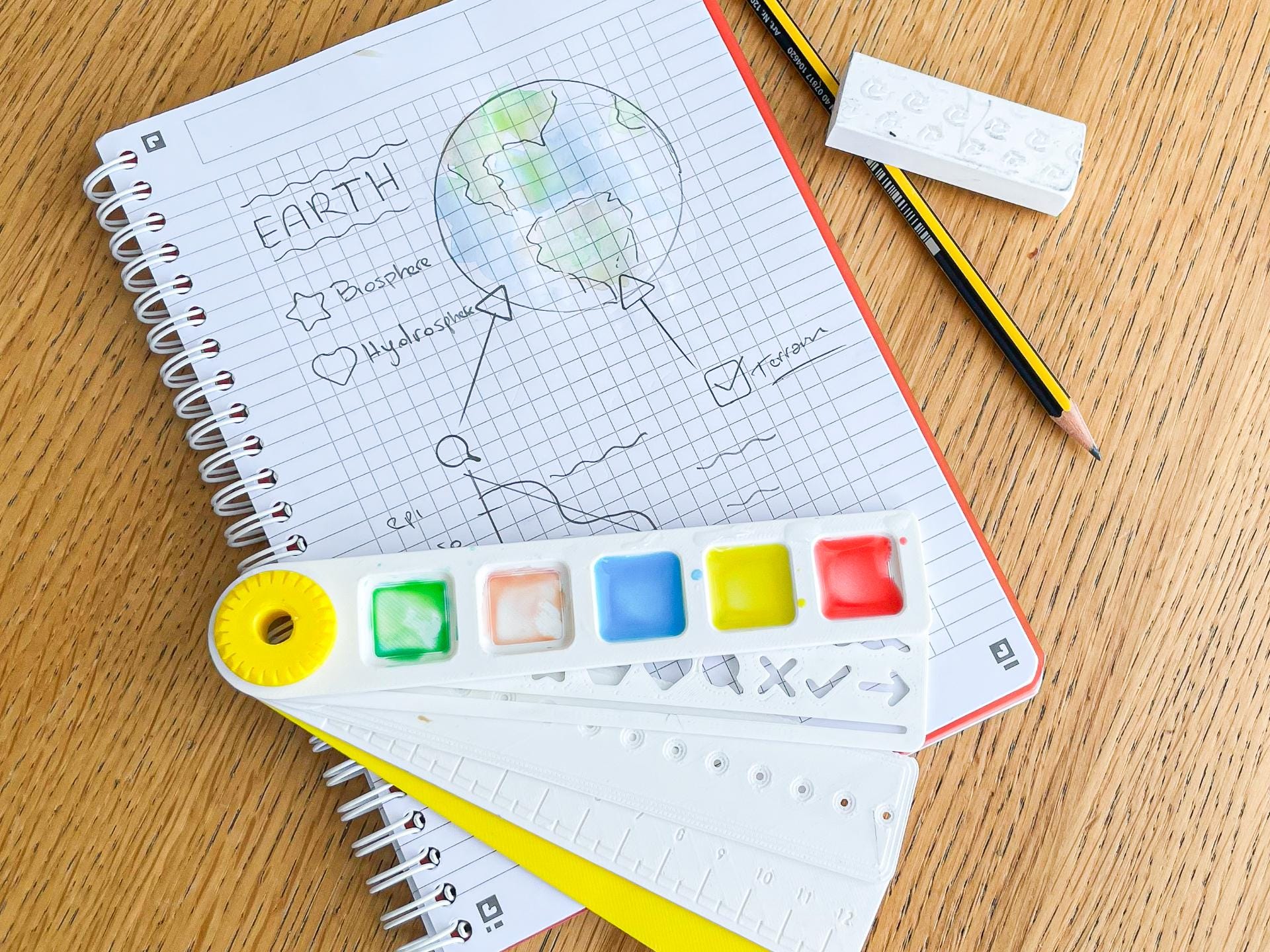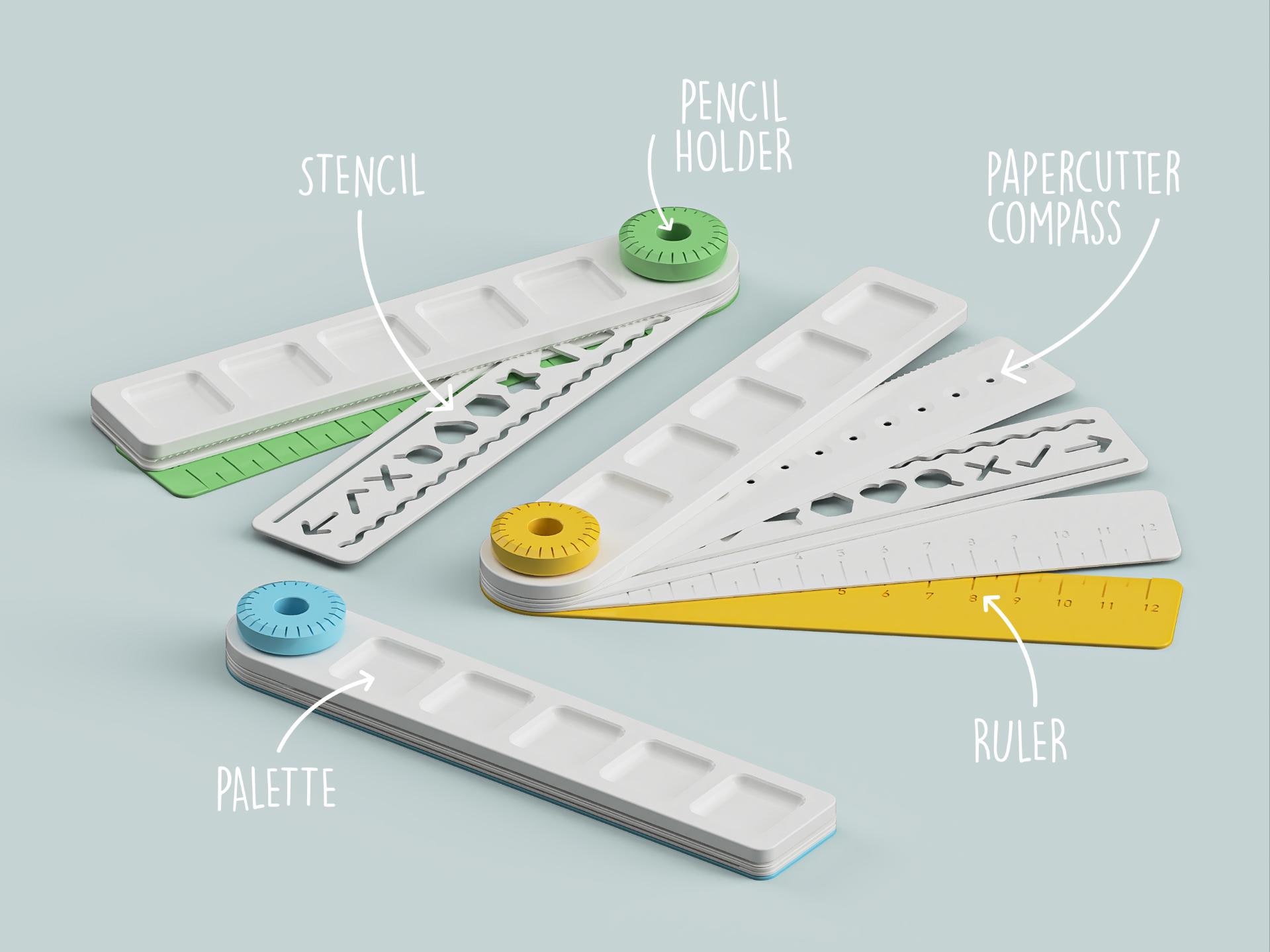 This compact and versatile set consists of several essential tools for the school environment, all joined by a handy pencil holder that ensures order and portability. All the tools can be easily stacked in the order you prefer and held together by the bolt, making this set extremely portable and suitable to be carried in a backpack without taking up too much space.