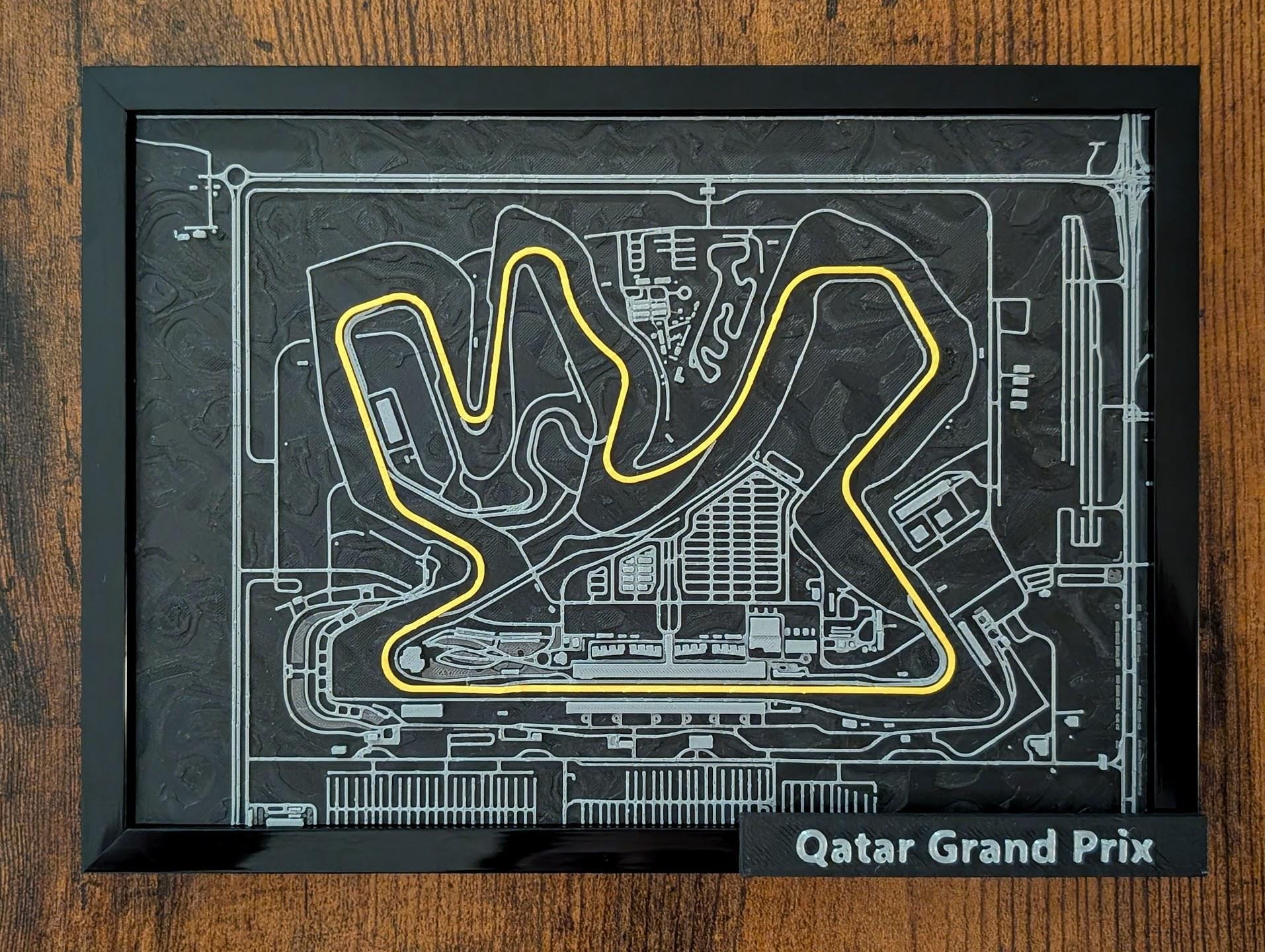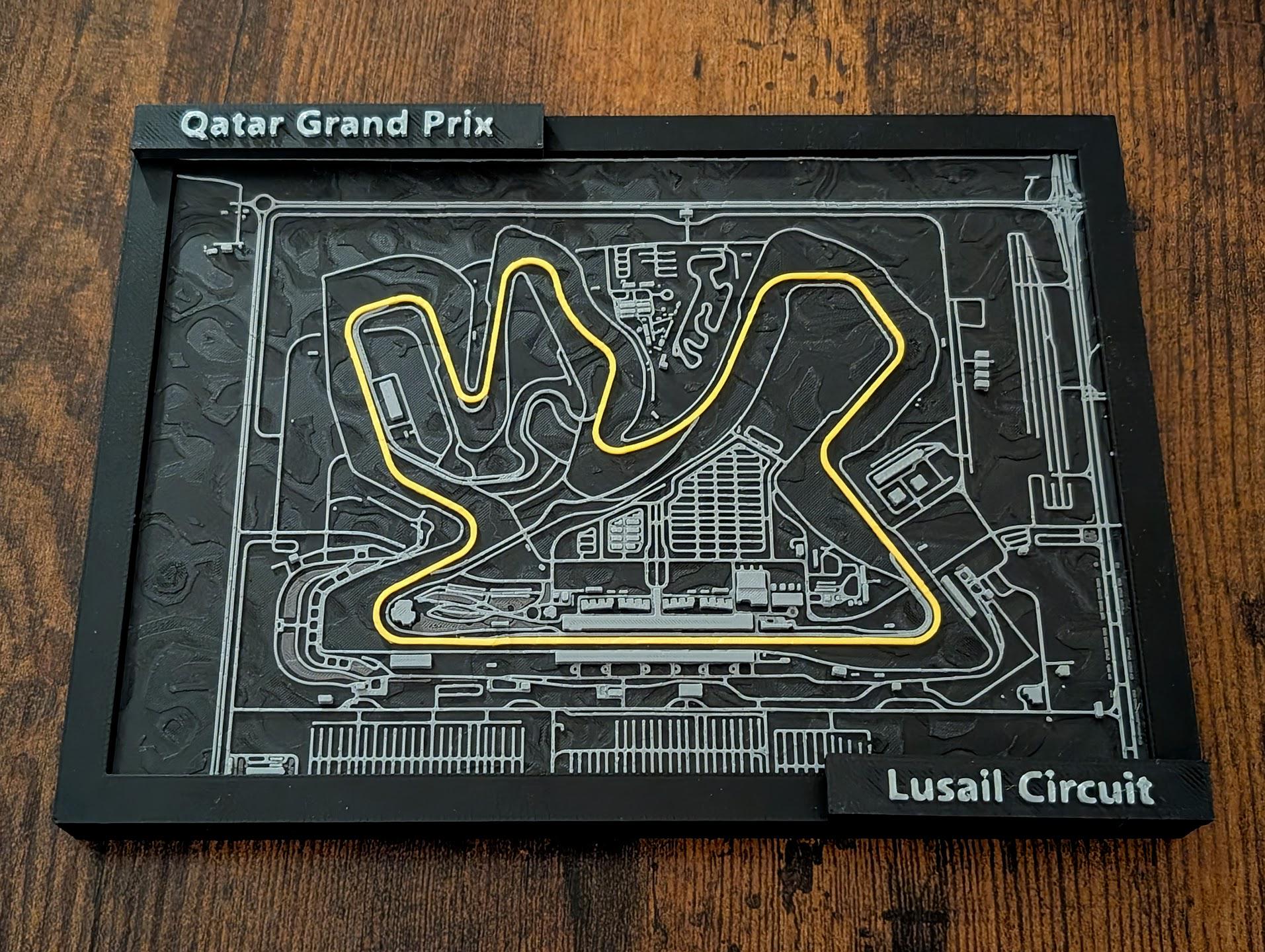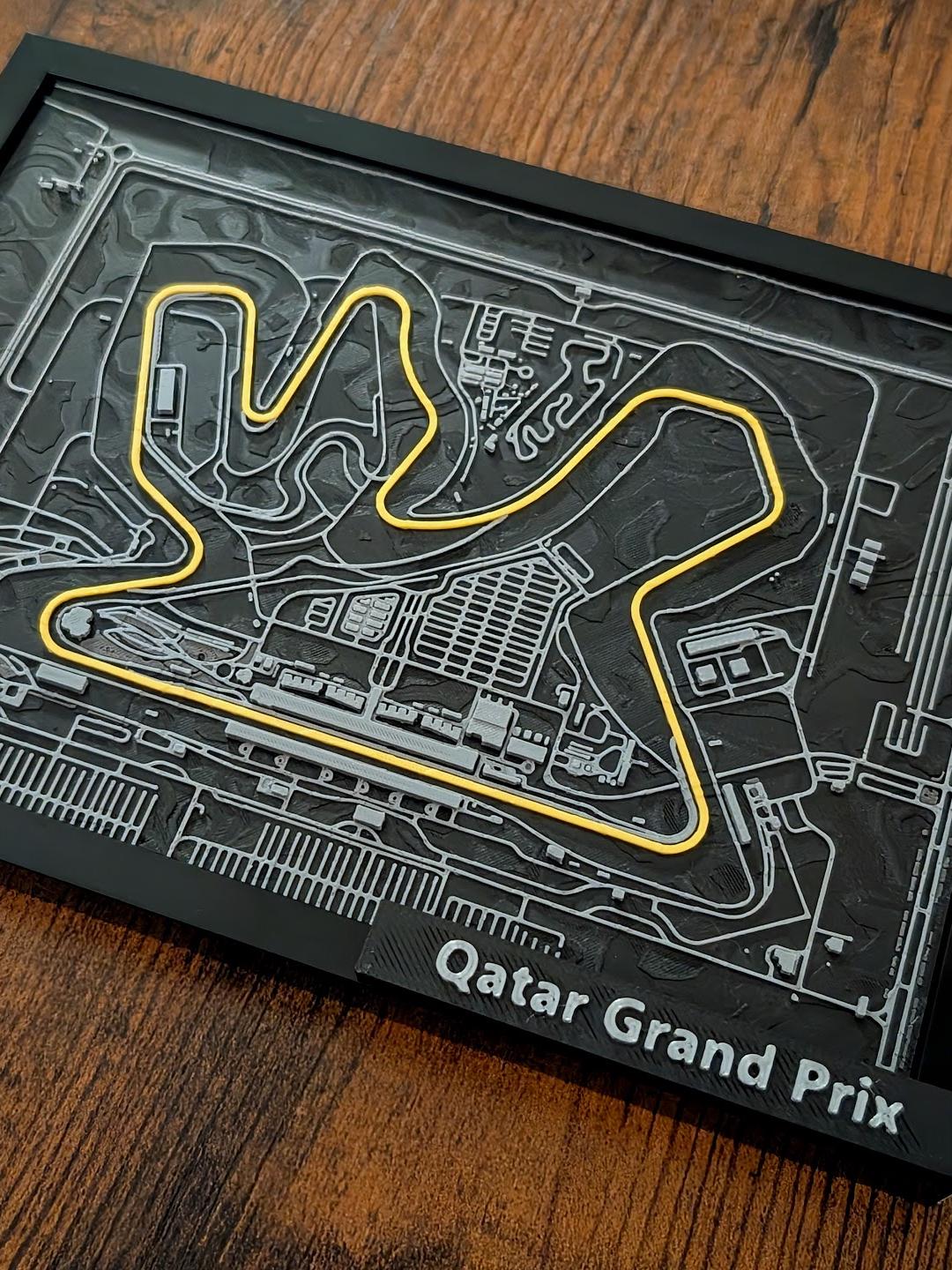 Celebrate the Qatar Grand Prix with this beautifully detailed 3D-printed circuit map, featuring the iconic Lusail International Circuit in a layered, framed design.