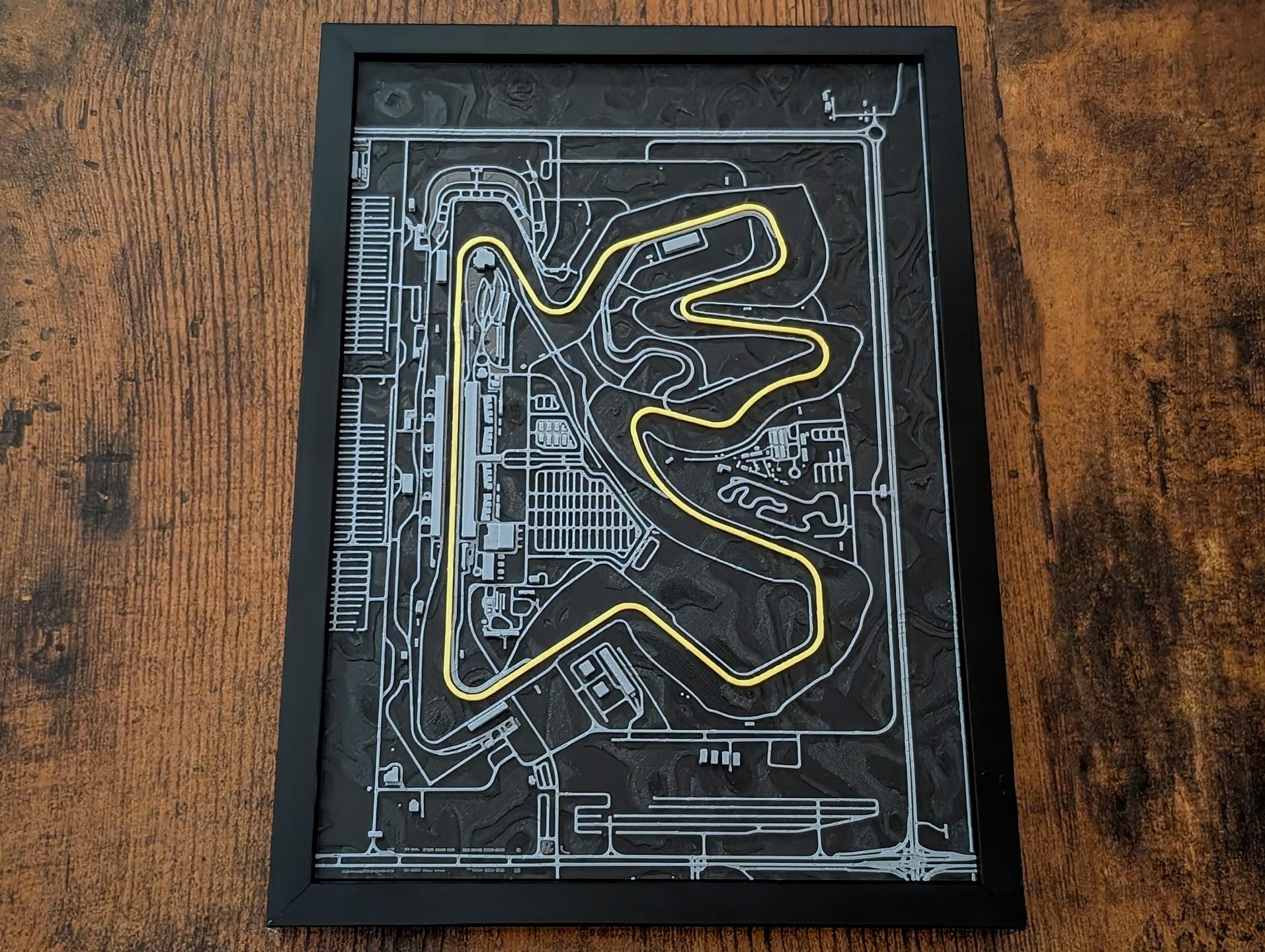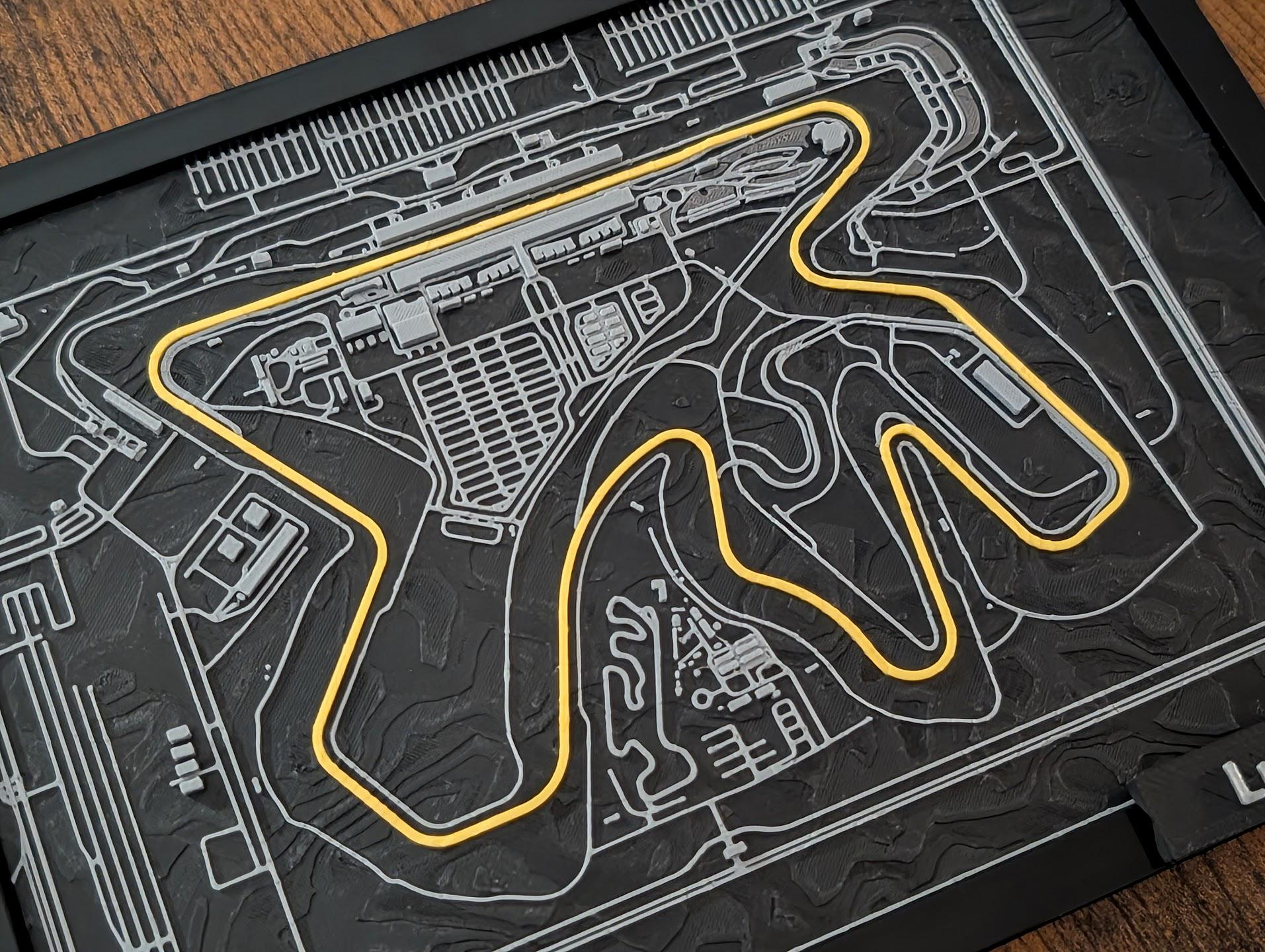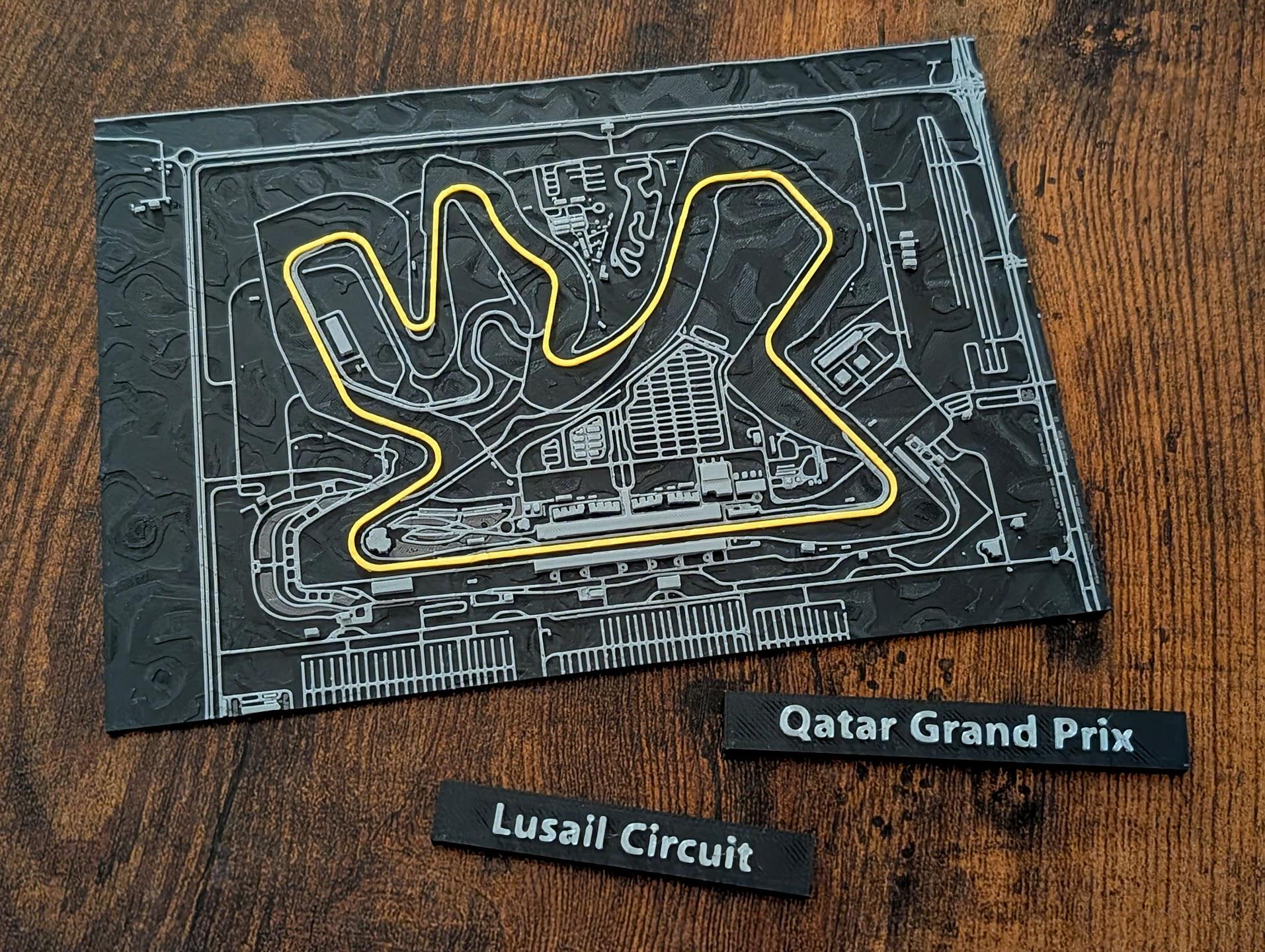 Celebrate the Qatar Grand Prix with this beautifully detailed 3D-printed circuit map, featuring the iconic Lusail International Circuit in a layered, framed design.